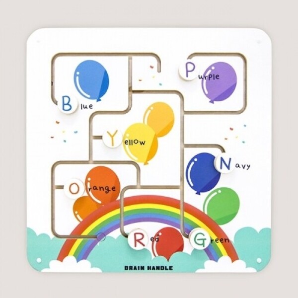7개의 알파벳 조각을 레일을 따라 움직이며 무지개 컬러의 영어 낱말을 찾아가는 컨셉의 학습놀이 촉각교구